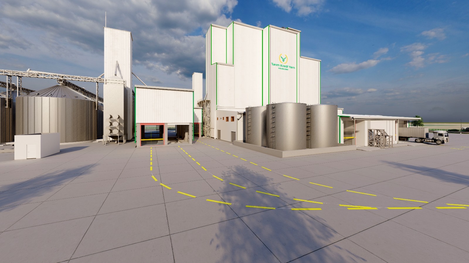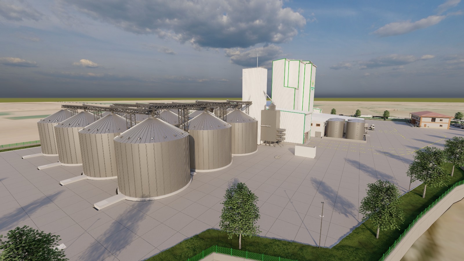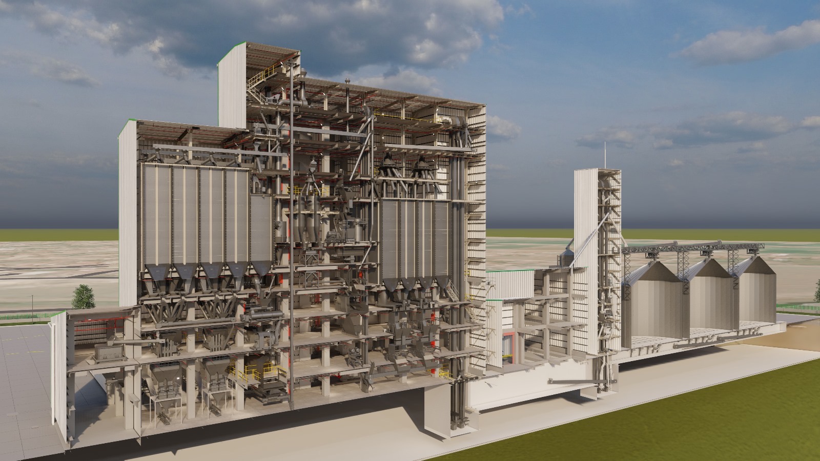A comprehensive industrial complex featuring a production facility, horizontal storage areas, elevator towers, and steel silos.