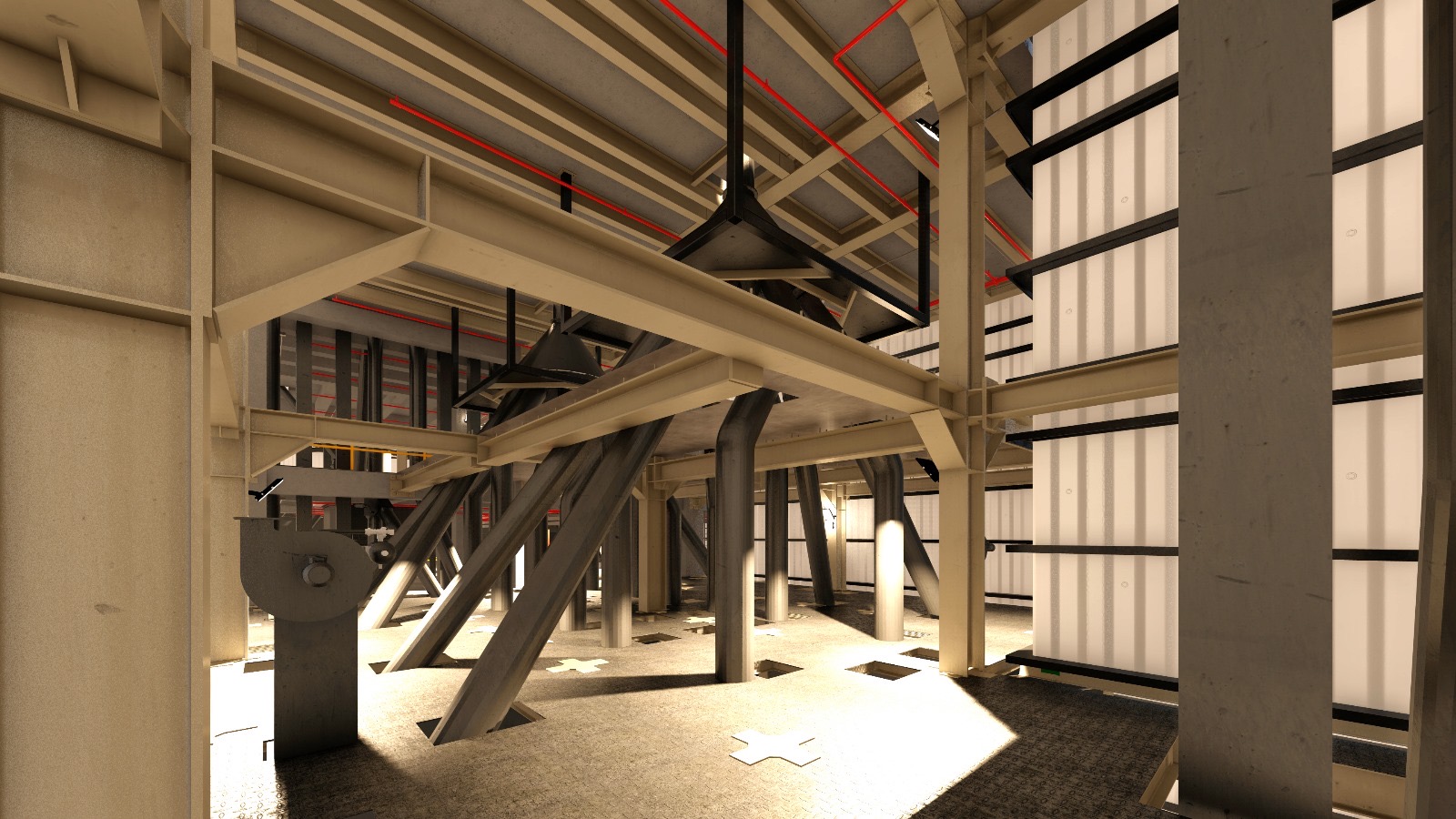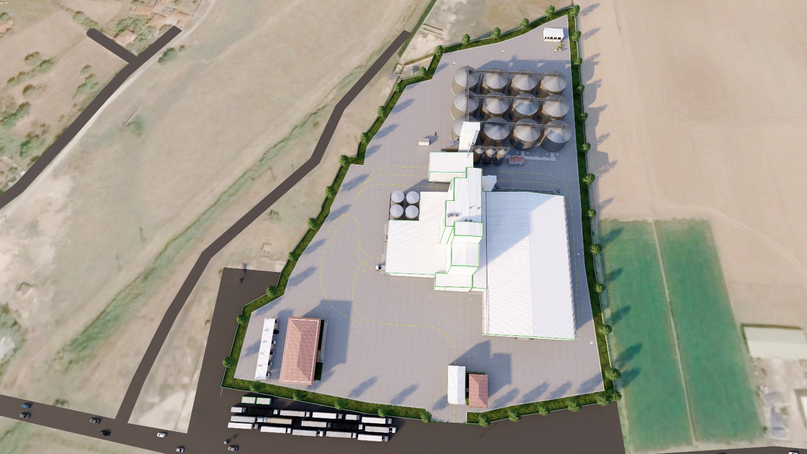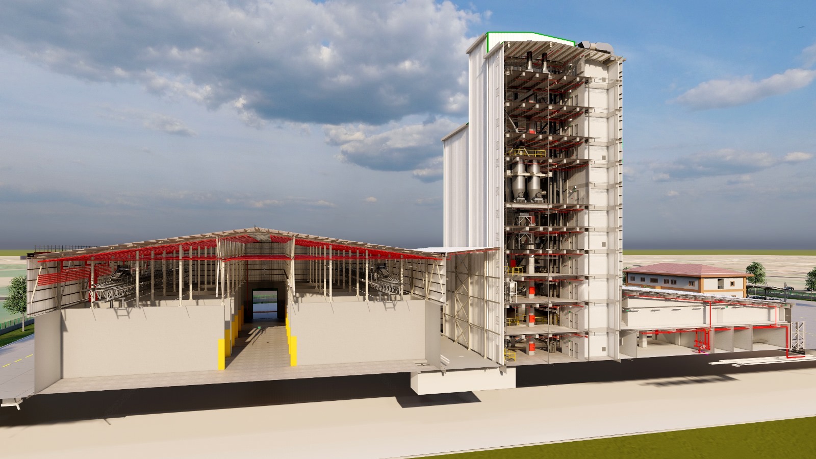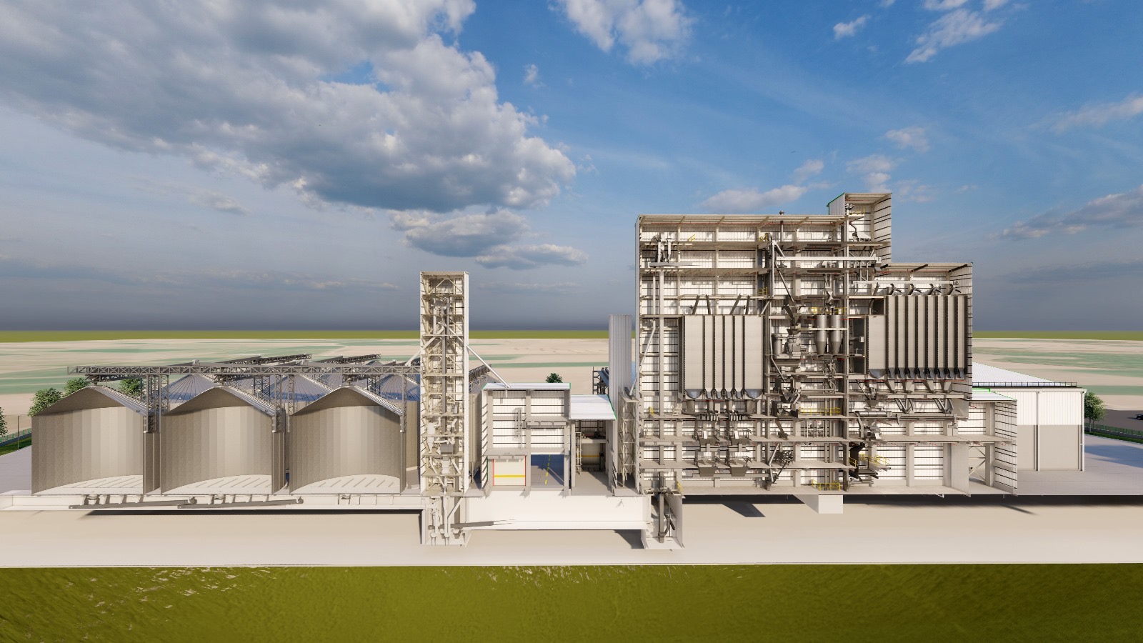 A comprehensive industrial complex featuring a production facility, horizontal storage areas, elevator towers, and steel silos.